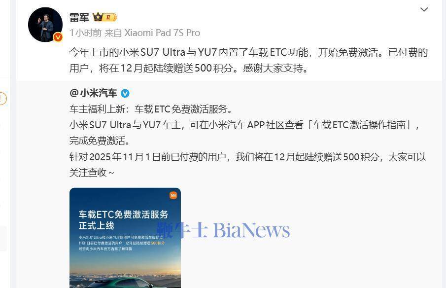 11月19日正规配资平台推荐,雷军发布微博称,今年上市的小米SU7 Ultra与YU7内置了车载ETC功能,开始免费激活。已付费的用户,将在12月起陆续赠送500积分。感谢大家支持。